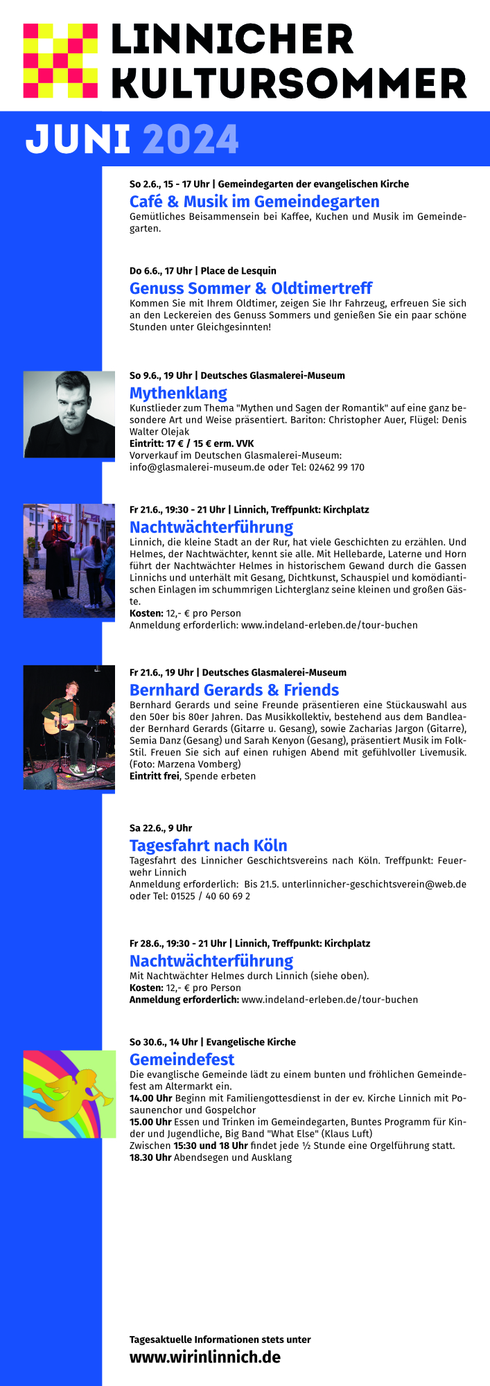 Das Programm zum Linnicher Kultursommer 2017 beinhaltet über 50 Aktionen und Veranstaltungen von Mai bis Oktober.